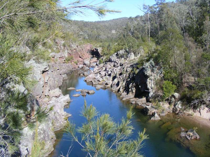 The steep sides of the gorge are covered in shady casuarinas and other native vegetation. Rugged cliff face meets the riverbed, creating a system of pools and rapids that provide important habitat for aquatic life.