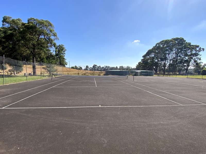 Two fenced asphalt fenced courts in good condition at the Boolarra Recreation Reserve. One court has a net and is free to use. The other court does not have a net. There is a tennis rebound wall.