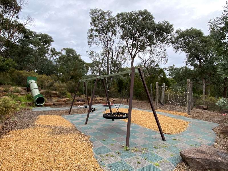 A simple playground with rock walls on two sides, tunnel slide, spinning disk, birds nest swing, two standard swings and climbing frame with rope nets and hanging disks.