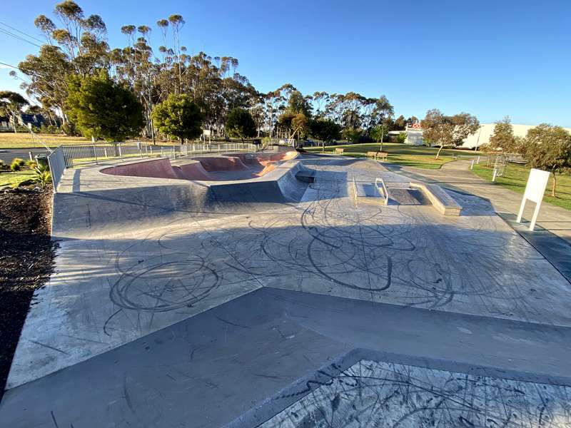 A really nice skatepark which has a long bowl plus a street course with quarters, boxes, ledges, banks and rails. One end has a quarter and the other end has a bank.