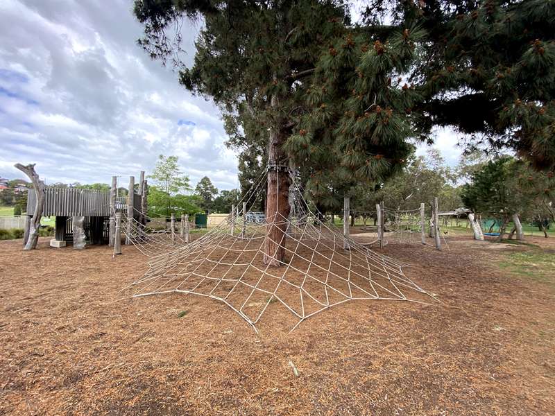 The playground has lots of rope climbing areas spread around the trunks of trees. It includes traverses, big nest of scrambled ropes, elevated tower reached by steps, birds nest swing, standard swings, big thick rope traverse bridge, hammock and balance beam. An area beside the main area has four swings and unshaded table.